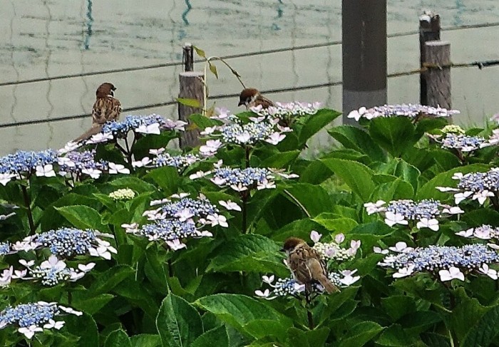 1ヵ所だけスズメが集まるアジサイの木があった。