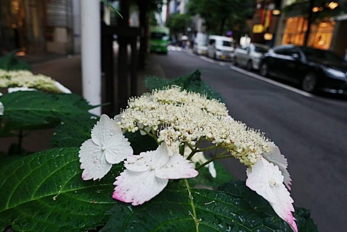 少し前に銀座の並木通りを歩いていたら、アジサイの蕾が見えた。