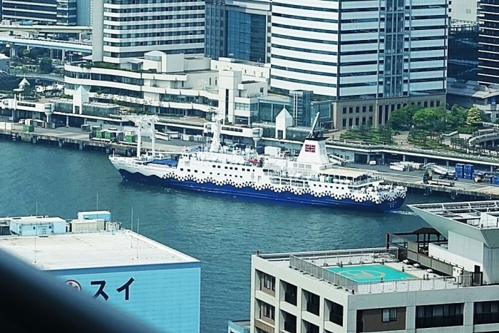 窓を開けて下を見たら、竹芝桟橋から大きな船が出て行くところだった。