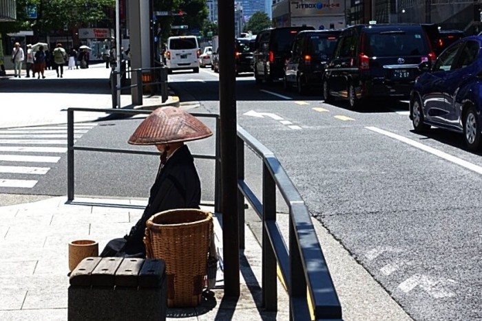 有楽町マリオンの前を通ったら、歩道の端に修行僧らしき男が座っていた。