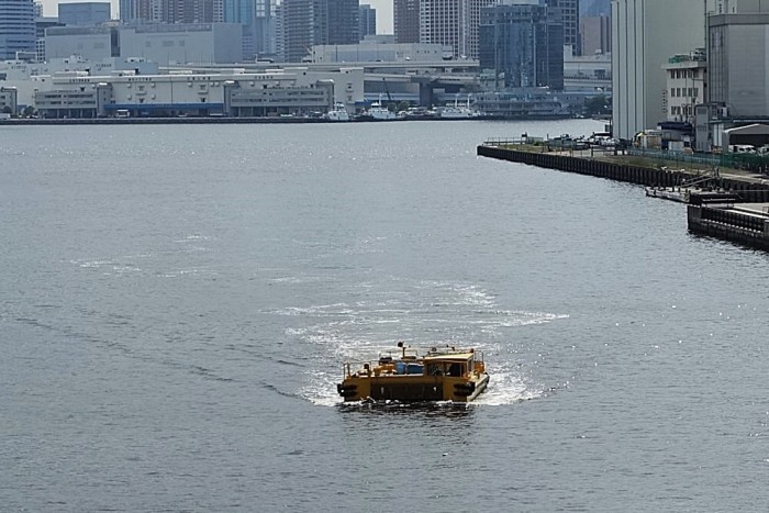 遠くから水上清掃船を見ることは多いが、たまたまマンションの裏の朝潮小橋を渡っていたら、東京湾の方から水上清掃船が来るのが見えた。