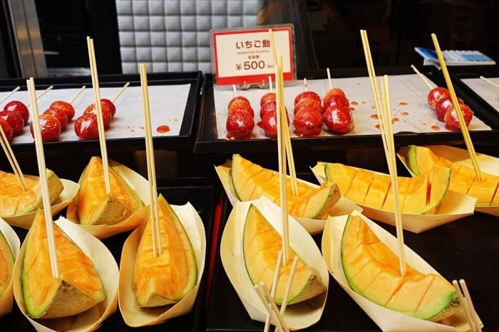玉子焼きで有名なテリー伊藤の実家の「丸武」では、串刺し玉子焼きが少し前の100円から150円になっていた。いちご飴が串に3個刺さっていて、500円もする。