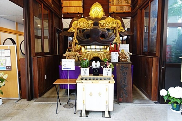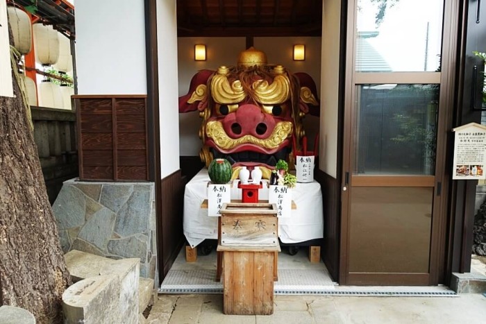 波除神社の鳥居をくぐると、右側に「天井大獅子」、左側に「お歯黒獅子」の2つの獅子頭がある。私の行った6月7日は波除神社の例大祭の日に当り、この日から3日間は盛大な祭が行なわれる。買い食いに夢中の外国人観光客は、まだ祭のことを知らず、ここまでは来ていない。日本人ガイドに案内されたわずかな観光客が来ているだけだった。