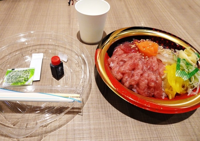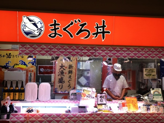 『そのフードコートとスーパーの間にあるのが、「まぐろ一番本舗」である。そこには「築地場外市場のマグロ丼より美味しい」と言われている「新鮮まぐろ大漁盛り丼」が864円で売られている。「たかが切り落とし」と侮るなかれ!店主は「これは市場に入荷するマグロのプロが、仲買人の目利きで先買いしているマグロから出た補材部を仕入れて使っている。だから高級な寿司屋で使うマグロと同じ味質』