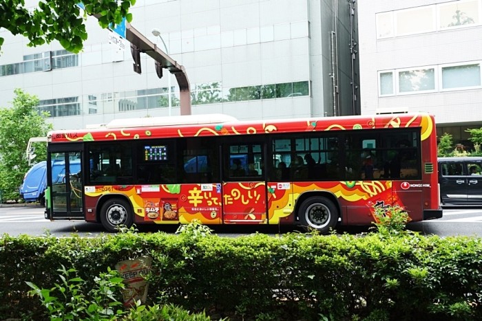 最近の都バスは広告が派手になった。