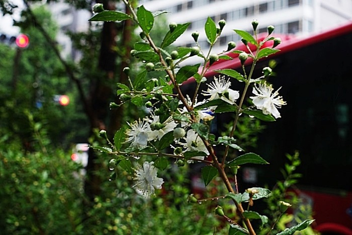行く途中の道路に、可愛い花が咲いていた。これが夏ごろに小さなたくさんの実を付けるのである。