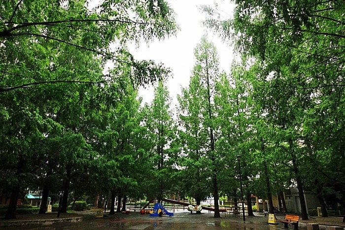 メタセコイアの木の下には、雨に濡れた子供用の遊具が置いてある。