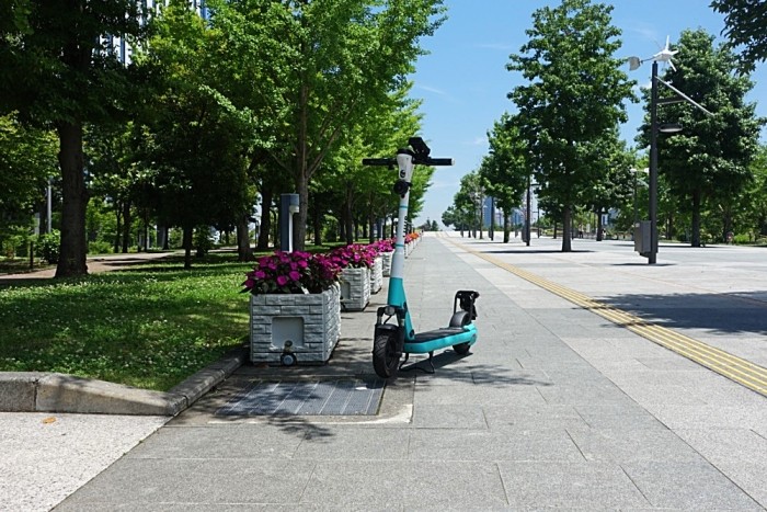 置き忘れたのではないだろうが、ひと気のないところに電動キックボードが置いてあった。思わず花壇の花を入れて、写真をパチリ。