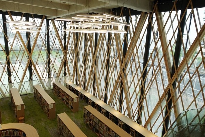 木材を多用した設計なので隈研吾氏の作かと思ったら、日建設計だった。ここは元東京オリンピック選手村だった「HARUMI FLAG」に隣接しているせいか、蔵書は学童向けだった。オープン初日に行ったので、お土産に本を入れる手提げ袋を頂いた。