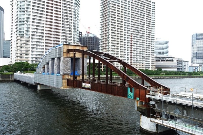 豊洲に近付いたところに「春海橋」に並行して「春海鉄橋」があるが、この橋はIHIが造船所だった頃の引き込み線である。現在はこの鉄橋を修理して、遊歩道にする工事を行っている。ずいぶん前から工事をしているが、完成は令和7年6月だそうだ。