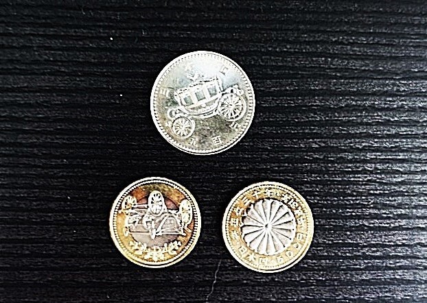 1枚目は「平成天皇即位記念硬貨」(平成2年発行・500円)と2枚目、2枚目は「平成天皇即位30年記念硬貨」(平成31年発行・500円)である。