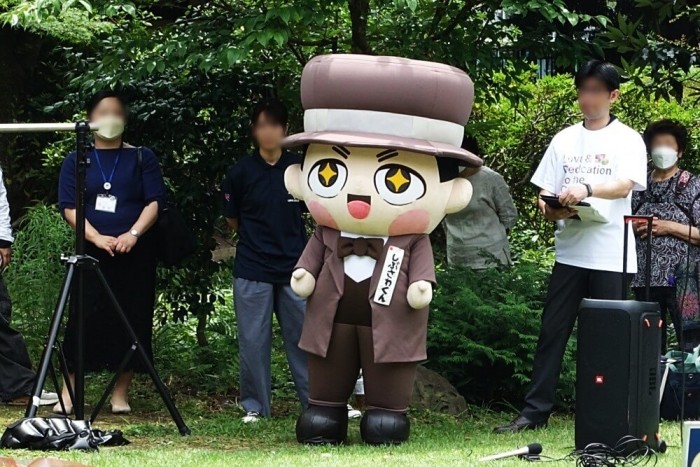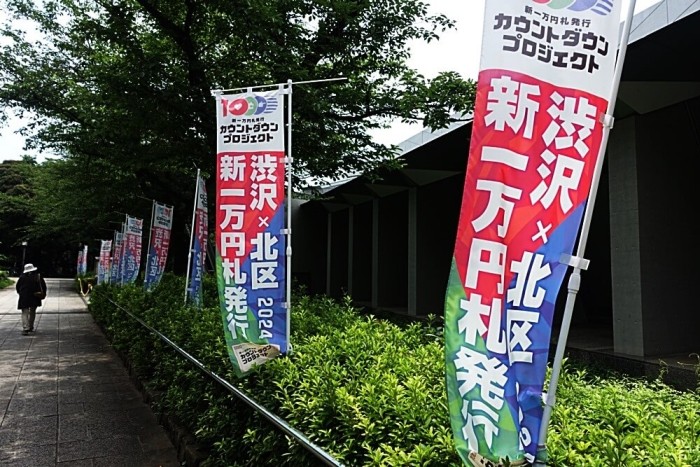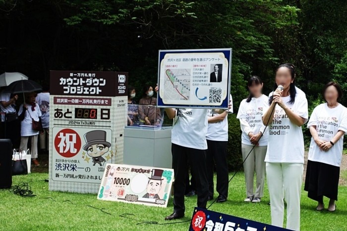 するとそこでは、「新1万円札発行カウントダウン・プロジェクト」というイベントをやっていた。暑い最中に大勢の人達が集まり、ぬいぐるみの「しぶさわくん」も登場していた。