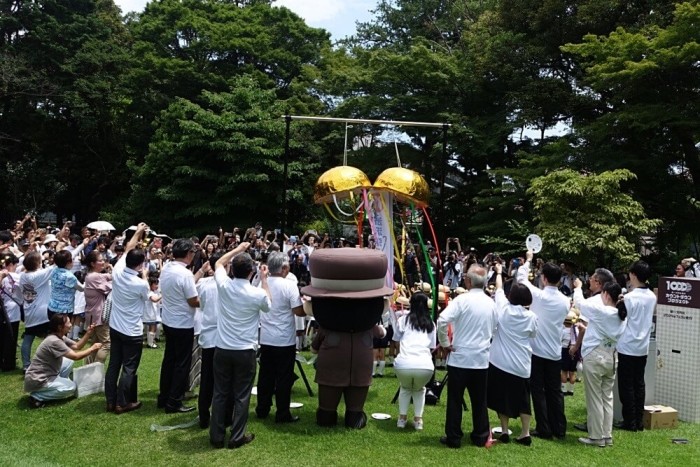 みんなに金色の小さなくすだまが渡された。そしてやっと大きなくす玉が割られた。