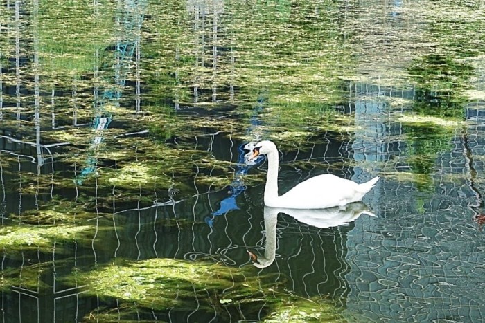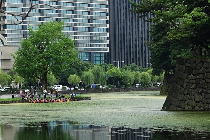 今年のお濠は暑さのせいか、水面を覆う水草が多いように感じる。