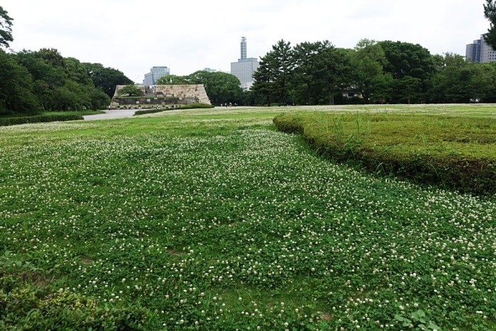 天守台の前は、大きく開けていて、芝生とクローバーが植えられている。