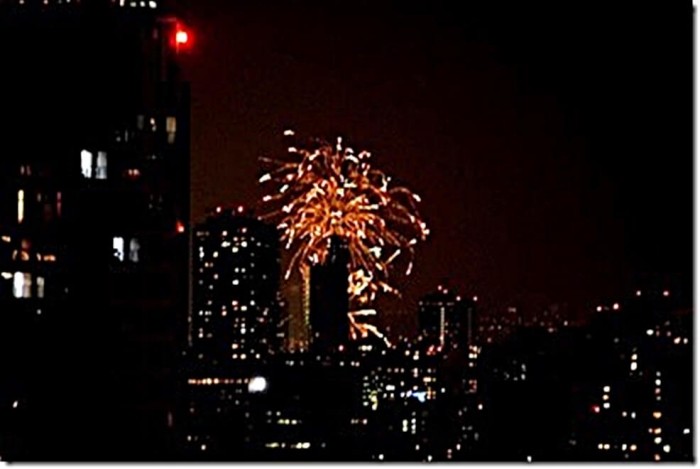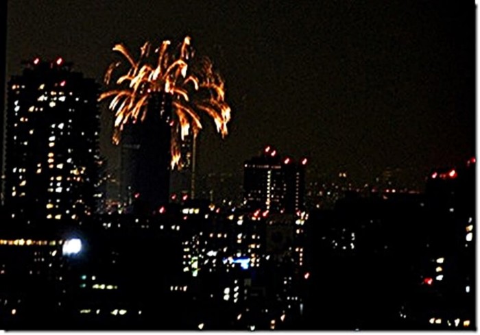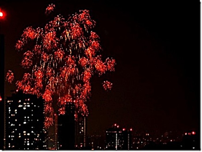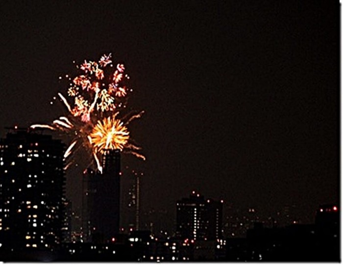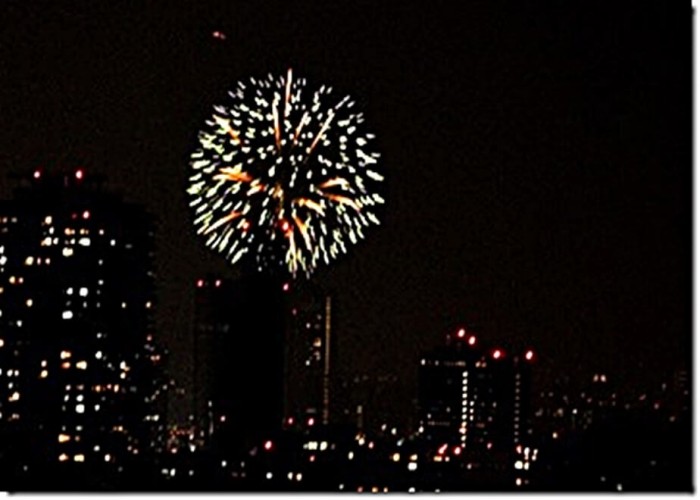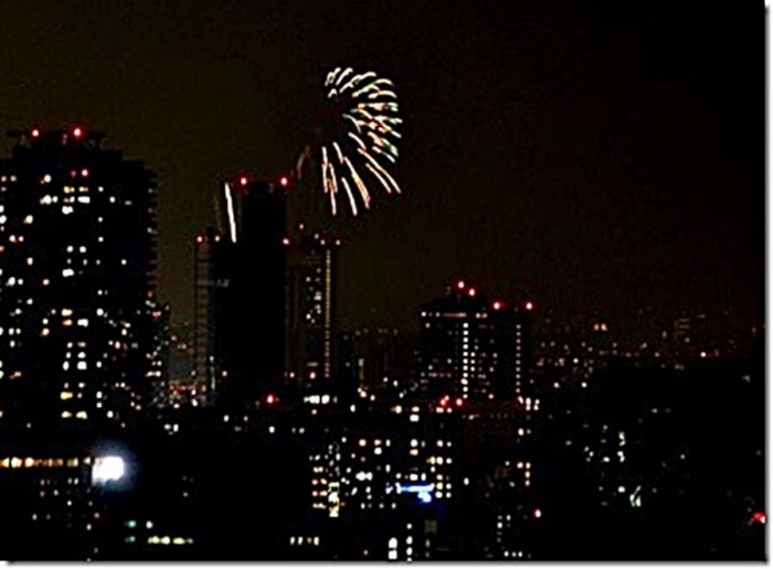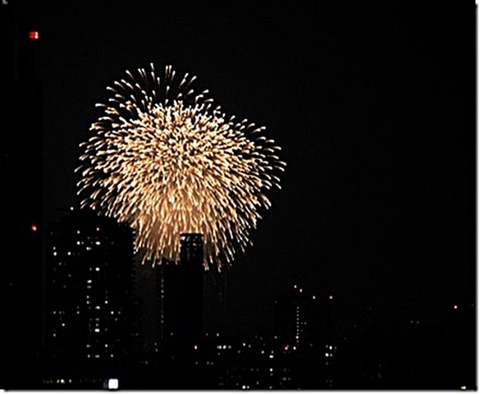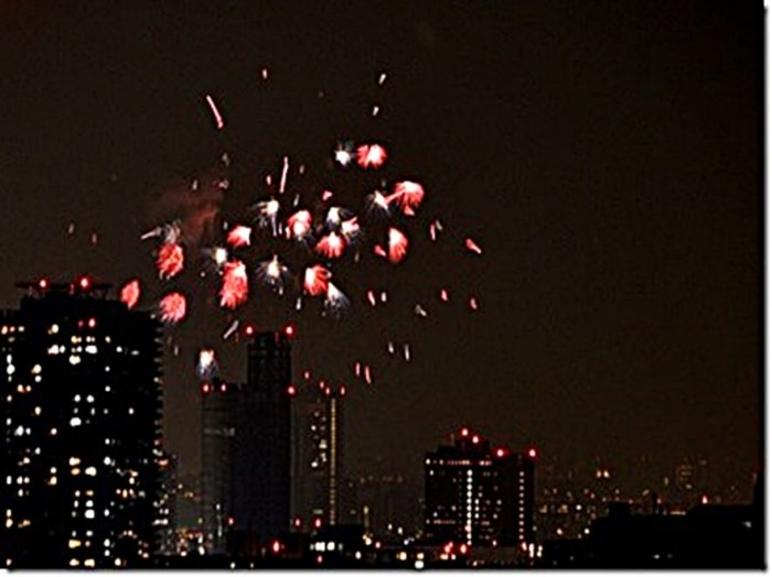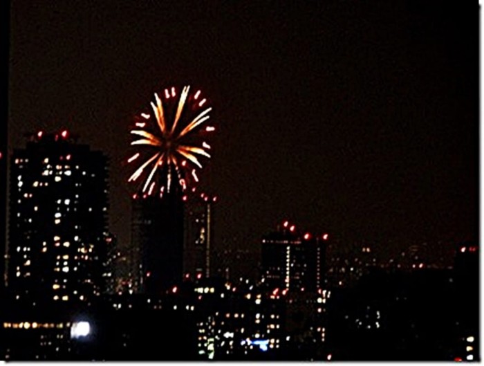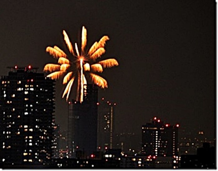 隅田川を溯った新大橋の向こうに見える茅場町のビル群の、更に向こうに花火は見える。花火は第一会場と、第二会場で打ち上げられるが、我が家からは第二会場の花火は見えない。