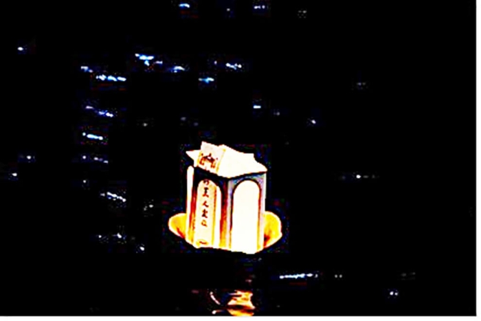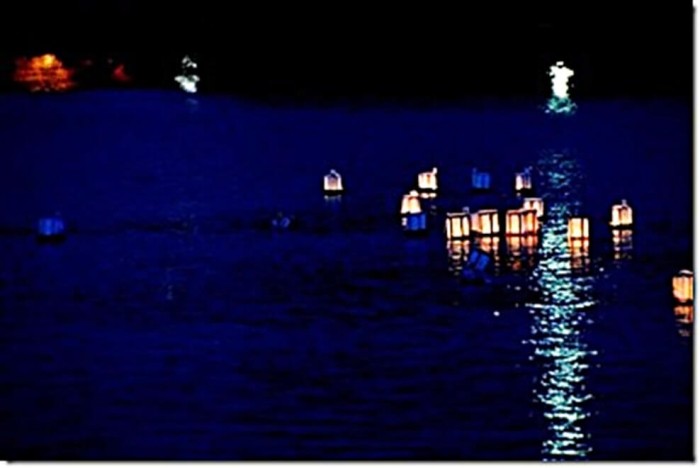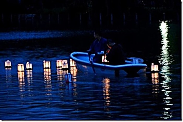 事前にボートで池に漕ぎ出していた若い僧たちが、合図を境に一斉に灯篭に灯をともして池に放つ。