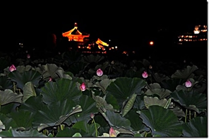フラッシュの明りに蓮の花が浮かび、遠くに辨天堂が金色に輝く。