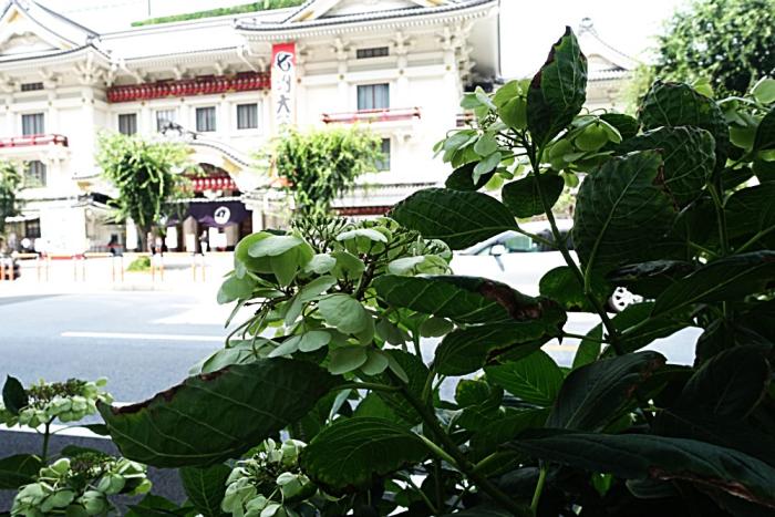 歌舞伎座の向かい側に来た時に、道路の植え込みにアジサイの花が咲いていた。