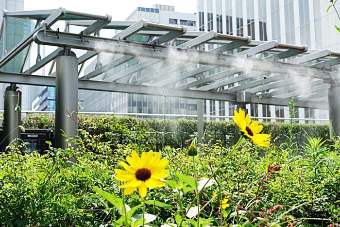 右側の公園は小さいが、お休み処では上からミストを噴射している。