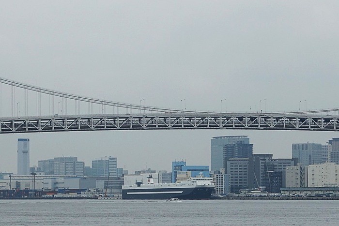 レインボーブリッジの向こうに、自動車運搬船が停泊しているのが見える。