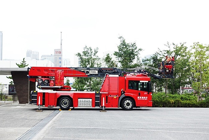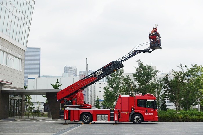 消防署の前を通ったら「はしご車」が出ていて、なにか訓練をやりそうな気配を感じた。しばらく待つと、消防士が2人、「はしご車」のバスケットに乗った。