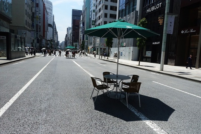 しかし暑い。歩行者天国にテント付きの椅子が置かれているが、誰も座っていない。
