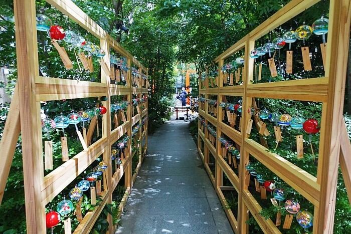 神社に続く小公園には、これまた小さな森がある。そこに木材で飾り棚を作り、両側にたくさんのガラスの風鈴が飾ってある。
