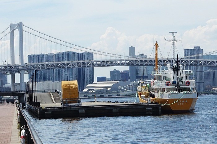 水上清掃船はよく見掛けるが、自分の足元を通過するタイミングに出会うのは滅多に無い。この日は8月15日でお盆休みの真っ最中だが、休まず働いている人も多いと知った。