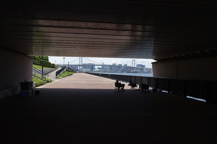 豊洲市場と専用桟橋の間は遊歩道を跨いでいるので、トンネル状になっていて日影が出来ている。そこにディレクター・チェアを出して、寝ている男が見えた。