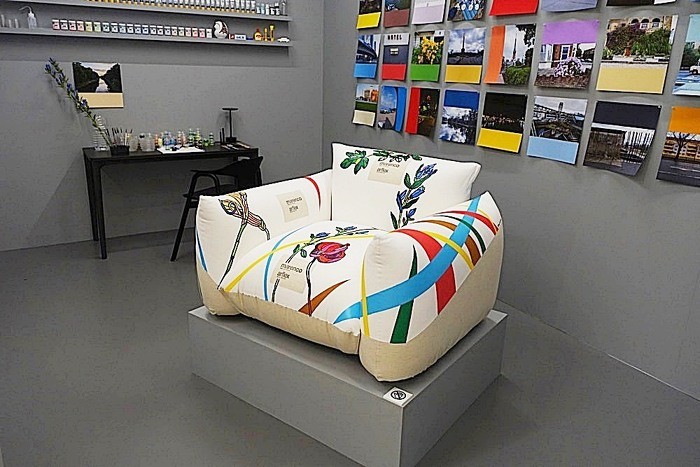 奥の床に置かれた椅子は、同じように原色で色付けされている。その近くの小部屋には、アッと驚くようなソファが置いてある。その奥には作者の作業部屋のモデルが作られている。