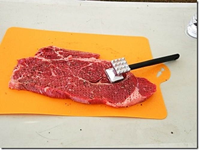 肉を叩き、塩コショウを振る。 裏側も同じようにする。