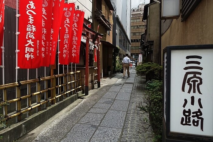 銀座4丁目交差点近くに、「あづま稲荷神社」がある。そこに入る路地は銀座で一番広いと思う。路地の名前は「三原小路」で、神社の先には飲食店が並んでいる。