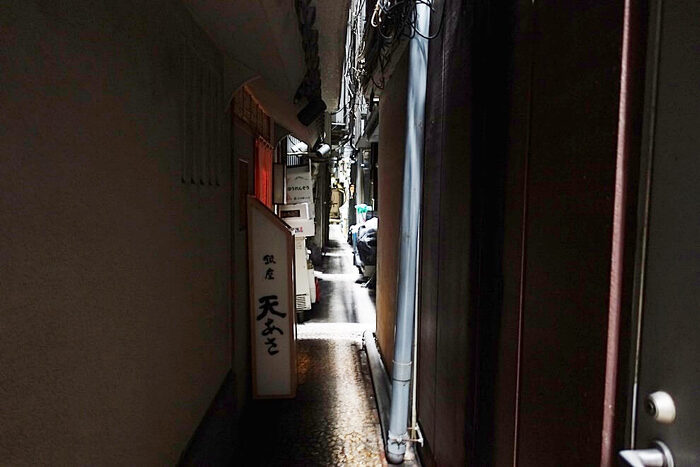 人がやっと通れる路地の途中に、飲み屋や天ぷら屋があったりする。