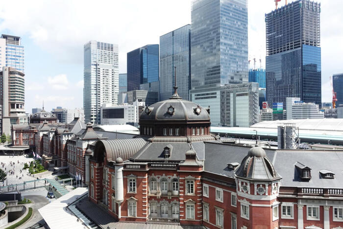 その後ろには多くの線路を越えて、「ミッドタウン八重洲」がそびえ立っている。