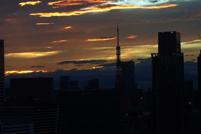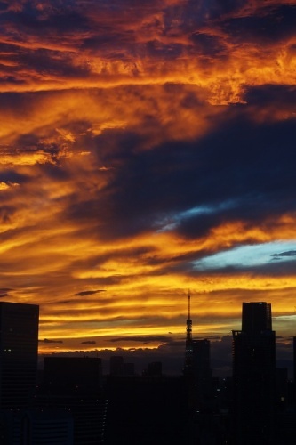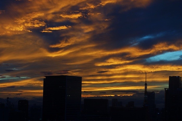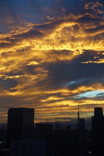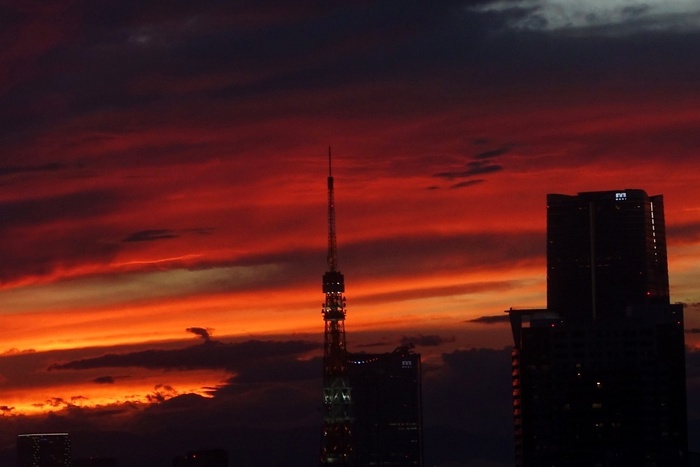 夕方になり、いつものように窓から西の方角に見える東京タワーを見たら、空が変な色になっていた。