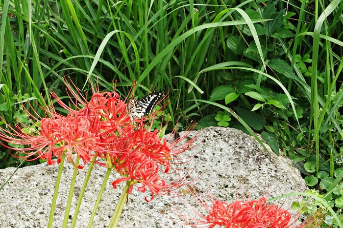 アゲハ蝶が飛んで来て、彼岸花に止まって蜜を吸っている。