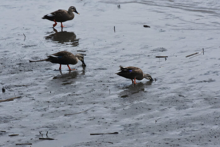 そこへカモが3匹やって来て、泥の中にクチバシを入れてなにか取っている。