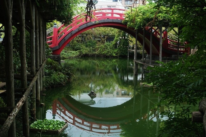 真っ赤な太鼓橋の向こうに、東京スカイツリーが見えた。