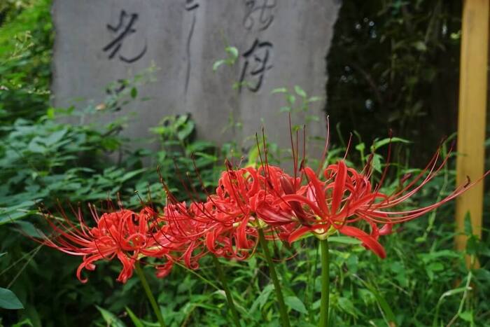 俳句の石碑の陰に赤いものが見えたので、近づいたら彼岸花だった。