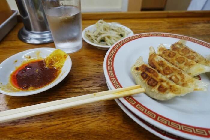 席に着いたら以前のように、注文もしないのに餃子が出て来る。1皿5個入りである。