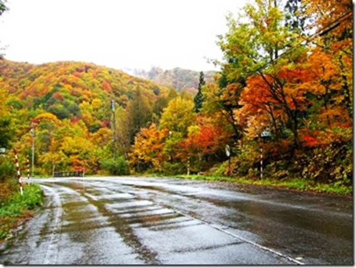 仕方なく戻り、途中にあった細い二股路を今度は右に行く。 通る車も無く、紅葉が素晴らしい。屏風岩は見付からず、30キロくらい続く紅葉の中を堪能して走る。