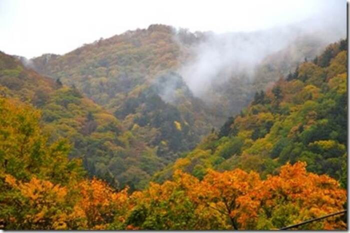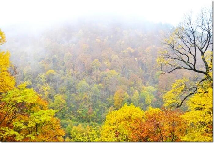 見渡す限りの山々が小雨と霧の中で紅葉している。