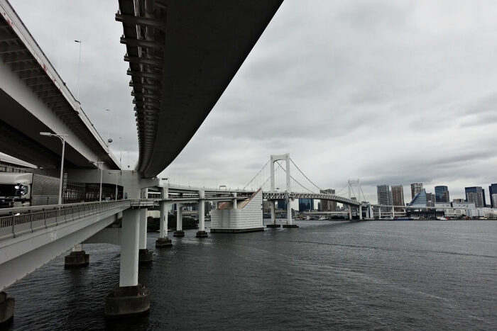 レインボーブリッジは二層式になっていて、上部は有料高速道路で、下部は中央に「ゆりかもめ」、その両横に一般道、さらに外側に遊歩道がある。芝浦から台場までの橋の長さは、798メートルである。途中に芝浦と台場の境界線の印が書かれている。