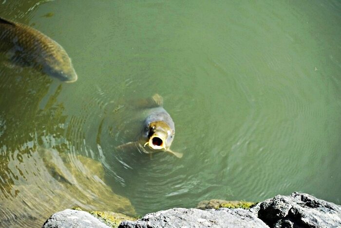 池の飛び石の上を歩いたら、鯉が寄って来た