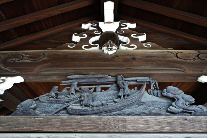 佃は昔は江戸浜という現在の東京湾の入口に面していて、海運業、各問屋組合をはじめ多くの多くの人々から海上安全、渡航安全の守護神として住吉神社は信仰を集めた。だから手水舎の上方にある木彫りの彫刻は、4面とも小舟や漁師が彫られている。なかなか芸術的な彫り物で、私はここへ来るといつも見上げている。