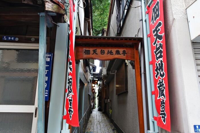 ここは非常に分かり難い場所にあるのだが、久しぶりに行ってみたら入口に真っ赤な幟が立っていた。家と家の間の狭い暗い路地を入る。少し行くと、右側に「佃天台地蔵尊」がある。ここでまた驚いた。