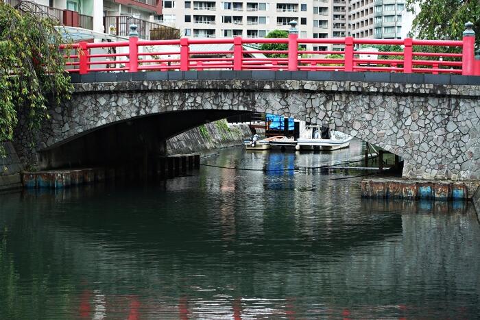 赤い欄干の佃小橋が、佃という下町の雰囲気に溶け込んでいる。