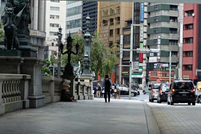 駅から10分くらい歩いて日本橋の上に出ると、いつものように橋の上では托鉢僧がいた。暑くても寒くても、彼はいつでもここにいる。ご苦労様である。