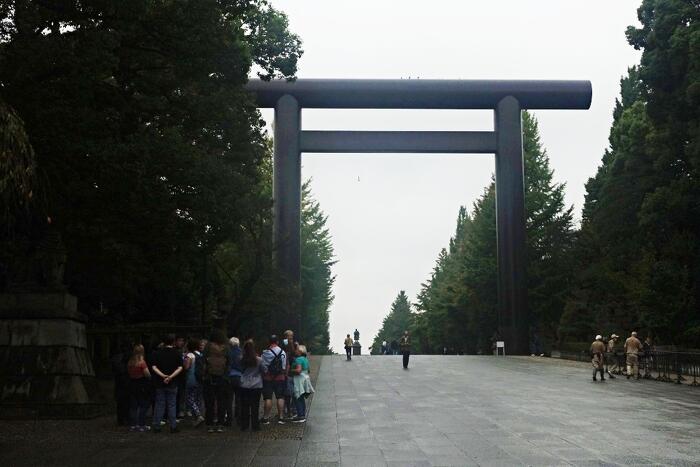 靖国神社の大鳥居の前では、外国人観光客が日本人ガイドの説明を聞いていた。